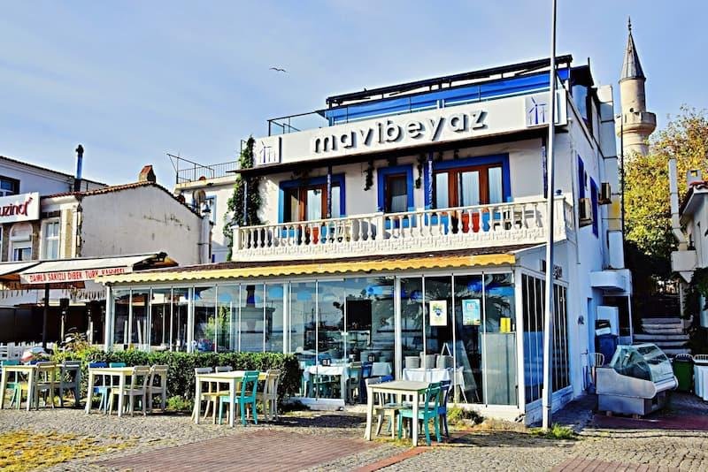 Bozcaada Liman tarafının en büyülü noktasında hizmet veren restoranlardan biridir Mavi Beyaz…